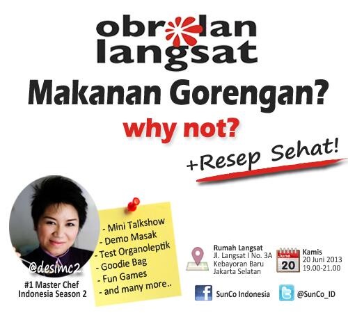 Nah, beruntung banget sore ini aku dapat undangan untuk hadir ke acara Obrolan Langsat : Makan Gorengan, why not? Thanks to Emak2 Blogger 🙂 aku jadi bisa dapat ilmu dan bisa aku share disini. Dan lebih kecenya lagi, semua makanan dan gorengan yang disajikan di acara Obsat malam ini menggunakan Minyak Goreng Sun Co lho. Yuks cekidot! 🙂