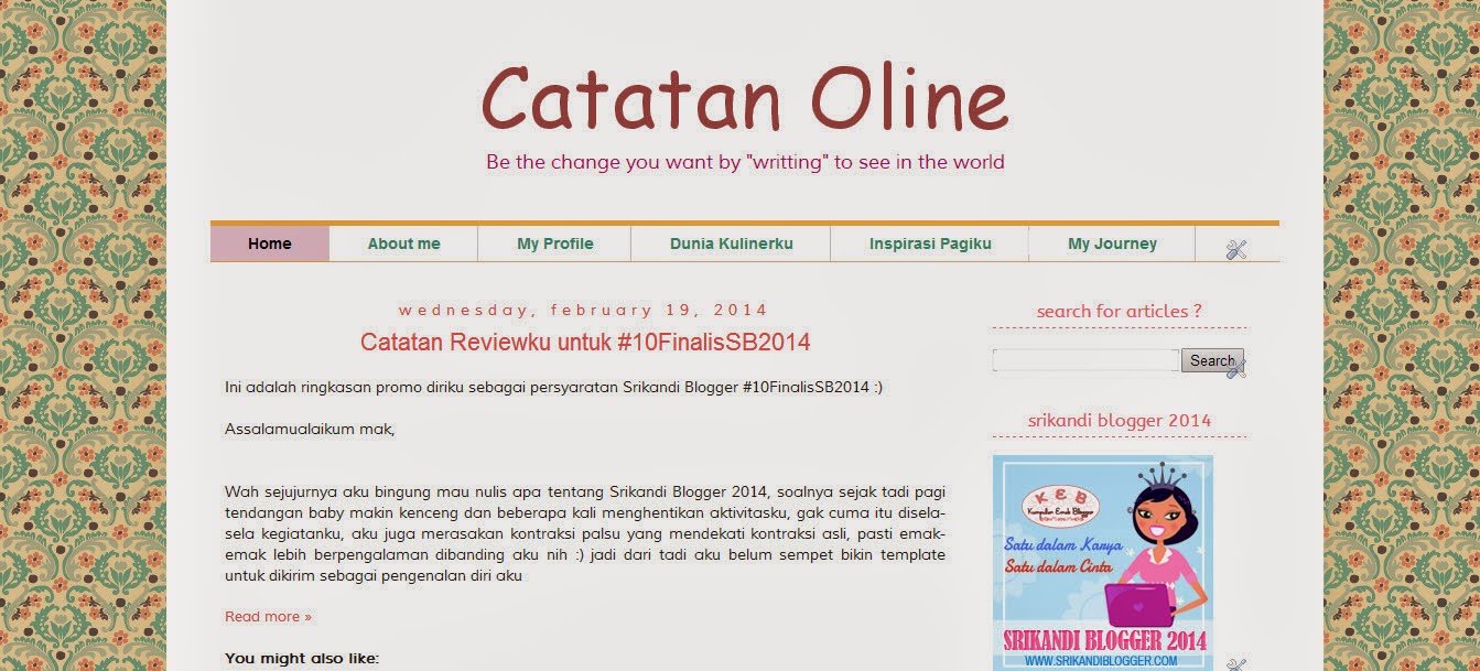 Eh iya, acara puncaknya udah tahu belum? Final Srikandi Blogger akan dilaksanakan pada tanggal 9 Maret 2014. Serunya, nanti yang akan hadir ada dress codenya lohhh! Dress codenya adalaahh baju tradisional Indonesia. Gak cuma kebaya. Bisa macem-macem. Sayangnya aku belum tahu bisa hadir atau tidak saat acara puncak nanti 🙂 yang pasti kudoakan semoga acaranya berjalan dengan lancar dan sukses 🙂