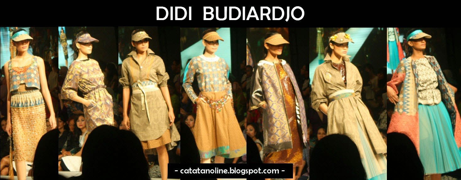 Kalau melihat foto diatas, ada yang berbeda gak? Yup betul, kalau diperhatikan ada 7 rancangan, berbeda dengan para desainer sebelumnya yang hanya 5 rancangan 🙂 dan tidak hanya itu, tiap model juga memakai topi yang nuansanya disesuaikan dengan bagian bawah. Rancangan pertama, model dress dikombinasikan dengan rompi tenun tanpa lengan. Rancangan kedua, atasan sekaligus bawahan dengan tenun warna coklat yang motif, simple tapi keren 🙂 Rancangan ketiga, mirip seperti rancangan kedua, namun kali ini ada kerah seleher dan kancing bukaan depan plus diberi ikat pinggang dengan aksen gold. Rancangan keempat, atasan lengan panjang dengan aplikasi dibagian leher (warna putih), yang aku suka roknya semi duyung 🙂 Rancangan kelima, jaket motif tenun dengan panjang selutut sangat pas dengan dalaman dress warna gold. Rancangan keenam, mirip dengan rancangan nomor 3, bedanya kali ini lengannya lebih 3/4 dan ada bukaan depan deh. Rancangan ketujuh, atasan dengan tenun, dikombinasi dengan rok lipat warna hijau, and yang aku suka adalah jaket selutut 🙂 sangat elegan. Akhirnya Didi Budiardjo keluar dengan mengkoleksi 6 karangan bunga, keren 🙂
