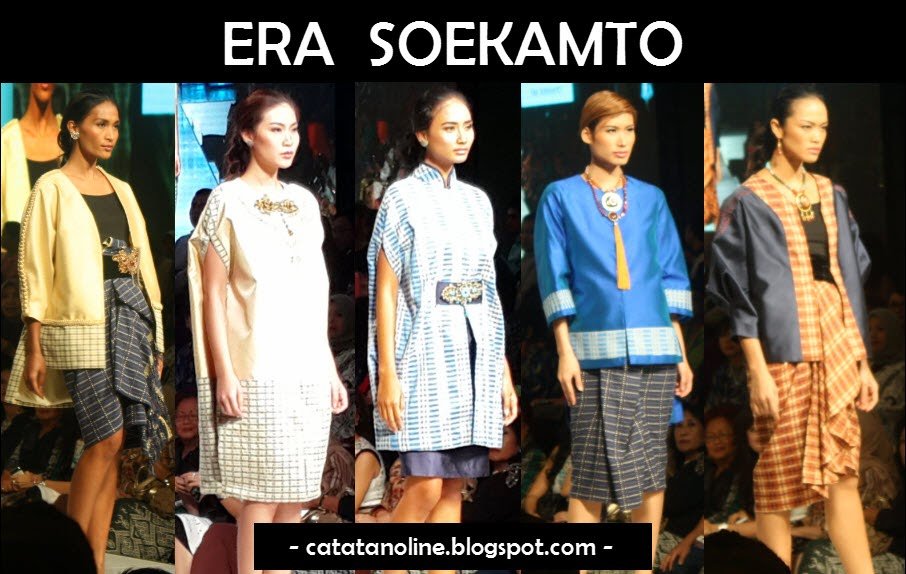 Berikutnya adalah favorit aku 🙂 Era Soekamto dengan tema Tapa, mengangkat Tenun Badui (Shoes by Mariska Fidya, Accesories by Dinaldi Yunadi). Background music awal bernuansa gamelan dan gong. Diawali dengan model yang bergerak dari sisi kiri ke sisi kanan, membuat penasaran bagaimana model busana-nya 🙂