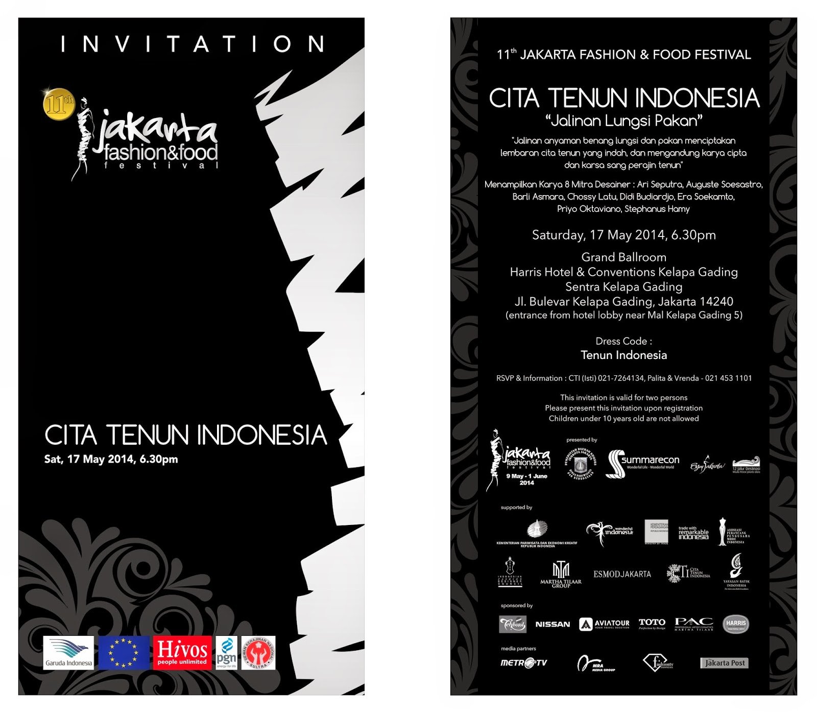 Alhamdulillah hari itu aku mendapat undangan dari BBlog untuk bisa berkesempatan hadir di fashion show Jakarta Fashion and Food Festival 2014. Rasanya super excited banget, pasalnya undangan fashion show yang akan aku hadiri kali ini adalah mengangkat tema kebudayaan Indonesia, yaitu Cita Tenun Indonesia (CTI). Sesuai dengan passion dan bidang usaha yang saya geluti yaitu batik dan tenun. Dengan deretan designer terkenal mulai dari Denny Wirawan (Sumba), Priyo Octaviano (Sambas), Aguste Susastro (Bali), Ari Seputra (Lombok), Era Soekamto (Badui), Barli Asmara (Garut), Chossy Latu (Sumbar), Didi Budiardjo (Bali Barat) dan Stephanus Hamy.