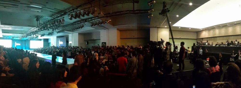 Nah dibawah tampilan foto 180 derajat yang memperlihatkan bagaimana suasana ruangan fashion show sebelum acara, sengaja sih saya foto saat terang, karena jika sudah mulai fashion show lampu pasti dimatikan, tenang bukan karena mau tidur kok, tapi agar perhatian penonton ke panggung catwalk. Bisa terlihat sebelah kiri tengah adalah panggung catwalk para model berjalan, nah disisi kiri dan kanannya penonton dengan posisi tempat duduk tribune, seperti biasa di bagian depan panggung catwalk sudah siap para fotographer, nah yang paling kanan (belakang) itu bagian sound system, narator, sampai lighting.
