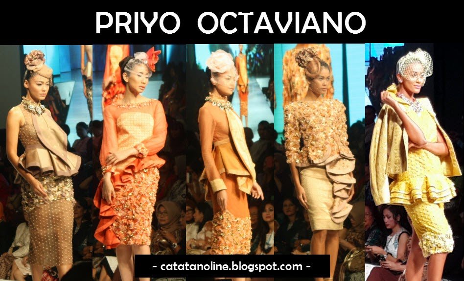 Yang berbeda kali ini, semua model menggunakan aksesoris topi yang disesuaikan dengan busana yang dikenakan, namun overall semua berbentuk bunga. Rancangan pertama baju pesta tanpa lengan yang transparan dibagian dada dan rok, wah yang memakai harus PD banget nih, nah untuk menutupi bagian tertentu tubuh diberi aksen bunga draperi, untuk bahan tenun dipakai dibagian depan (yang ada lipatan). Rancangan kedua dress pesta lengan panjang dengan warna dominan oranye, bahan tenunnya ada pada bustier yang digunakan, roknya aku suka banget, aplikasi aksen bunga draperi sangat detail dan mewah 🙂 Rancangan ketiga, mirip dengan rancangan pertama, bedanya kali ini dibuat lengan panjang dan tidak transparan, serta aplikasi aksen bunga berada bagian paling bawah. Rancangan keempat, bagian atas dengan lengan 1/2 menggunakan aplikasi aksen bunga terbanyak dari model baju yang lain, keren banget 🙂 Nah ini nih rancangan kelima, yang terbaik dari 4 rancangan lain menurut aku, warna dominan kuning gold, apalagi jaketnya full tenun dengan warna senada sangat elegan dan mewah. Setelah selesai, Priyo Octaviano keluar dan disambut dengan 4 karangan bunga 🙂