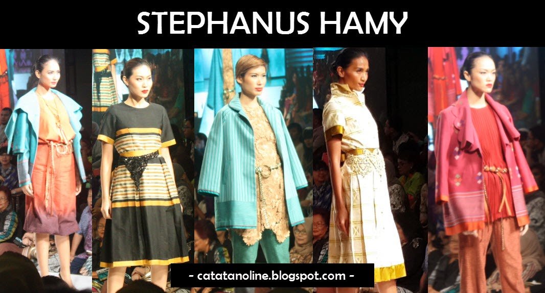 Rancangan pertama Stephanus Hamy adalah baju 3 pieces, atasan lengan pendek (kira-kira) senada dengan celana warna merah gradasi ungu dan jaket tenun lengan panjang dengan warna dominan biru. Rancangan kedua adalah tenun dengan nuansa hitam yang dikreasikan menjadi dress selutut plus ikat pinggang warna hitam yang di simpulkan ke belakang seperti kupu-kupu, rancangan yang simple tapi berkelas 🙂 Rancangan ketiga, atasannya seperti kebaya karena bagian bawahnya yang tidak rata trus celana panjangnya berwarna biru, sekilas mirip seperti jeans, namun ternyata setelah diperhatikan adalah tenun berwarna biru, jaketnya keren banget, aku suka sekali dengan jaket seperti ini, pas banget untuk acara formal 🙂 Untuk rancangan keempat, mirip sekali dengan rancangan kedua, bedanya kali ini menggunakan tenun berwarna putih dengan nuansa gold di lengan, ikat pinggang dan bagian bawah serta kerah seleher. Rancangan kelima sama seperti rancangan ketiga, bedanya kali ini dengan atasan polos merah, celana panjang warna coklat ditambah jaket tenun tanpa kancing. Diakhiri dengan tepuk tangan dari pengunjung, overall, keren 🙂
