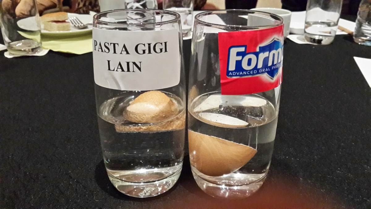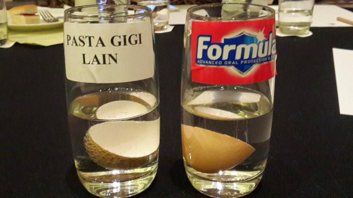 Nah, dalam rangka menjelaskan kandungan SPL tersebut, Formula mengadakan sebuah percobaan uji kalsium, yaitu bagaimana proses pengeroposan kalsium gigi terjadi dan fungsi lapisan pelindung dapat mencegah gigi keropos. Percobaan ini dilakukan dengan menggunakan cangkang telur. Kenapa? Karena teksturnya sama seperti gigi kulit telur terdiri dari kalsium, dan yang kedua adalah menggunakan juga cuka dapur yang menggambarkan asam mulut.