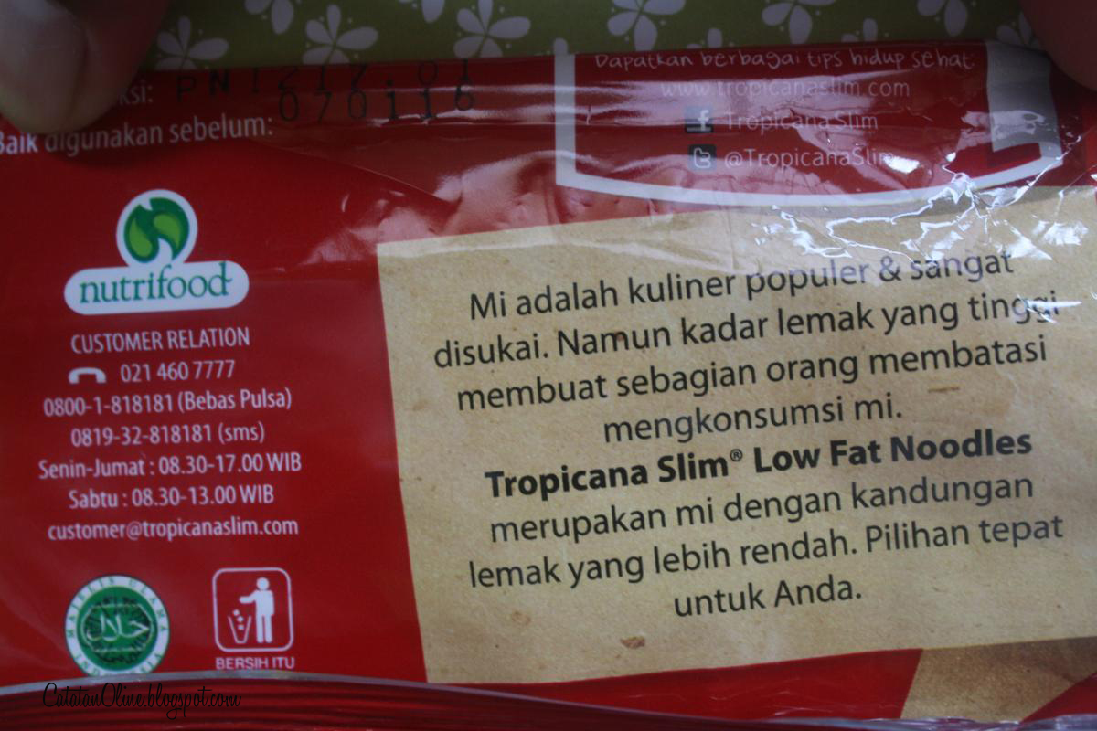 Mi Tropicana Slim ini adalah Low Fat Noodles. Artinya rendah kalori dan lemak. Sebagai penggiat diet, mie ini cocok banget buat saya. Apalagi saya ingin hidup sehat, makan enak tapi gak bikin gemuk *penting*.
