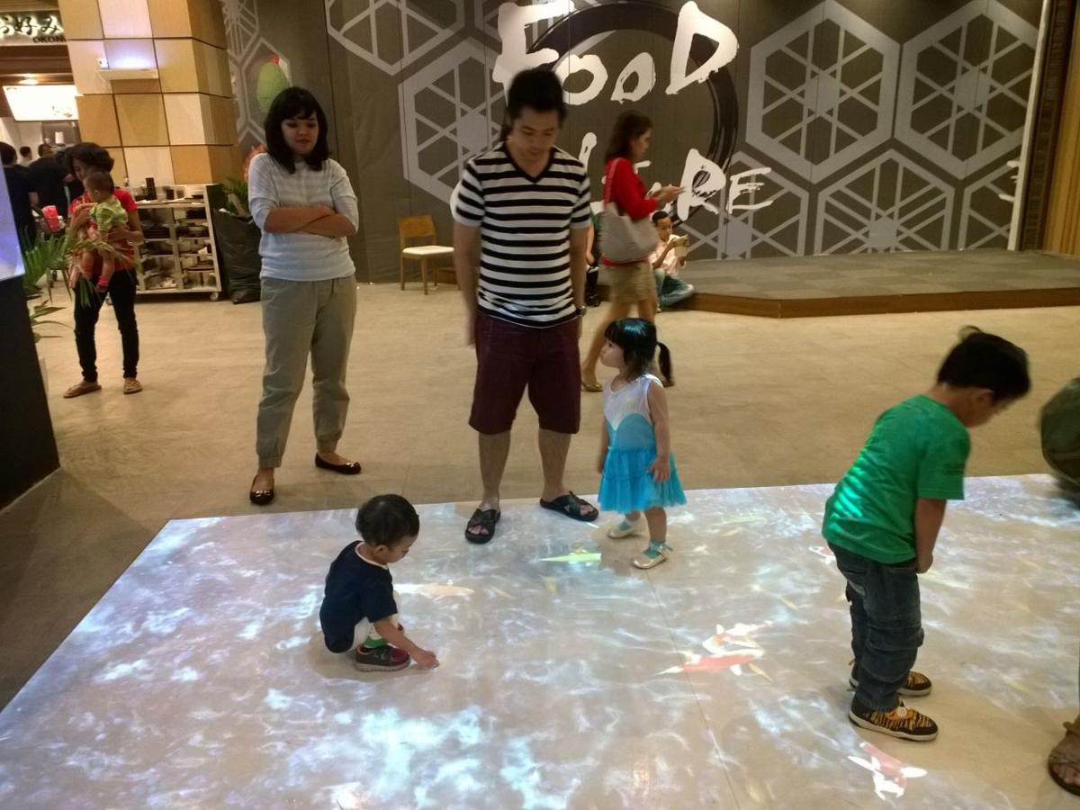 Jadi ini ada sebuah proyektor di bagian atas, ditembakkan ke bagian lantai bawah yang berwarna putih dengan gambar-gambar ikan. Ikannya terus bergerak. Ini animasi di dalam laut. Nanti anak-anaknya mencari gambar ikan di gambar ini. Waah, Narend senengnya bukan main. Diajak main kesini malah gak mau pulang qeqeqe 🙂 Ribet degh! Tapi setelah dipaksa gendong akhirnya mau juga, walaupun dengan tangisan kencaaaaang 😀