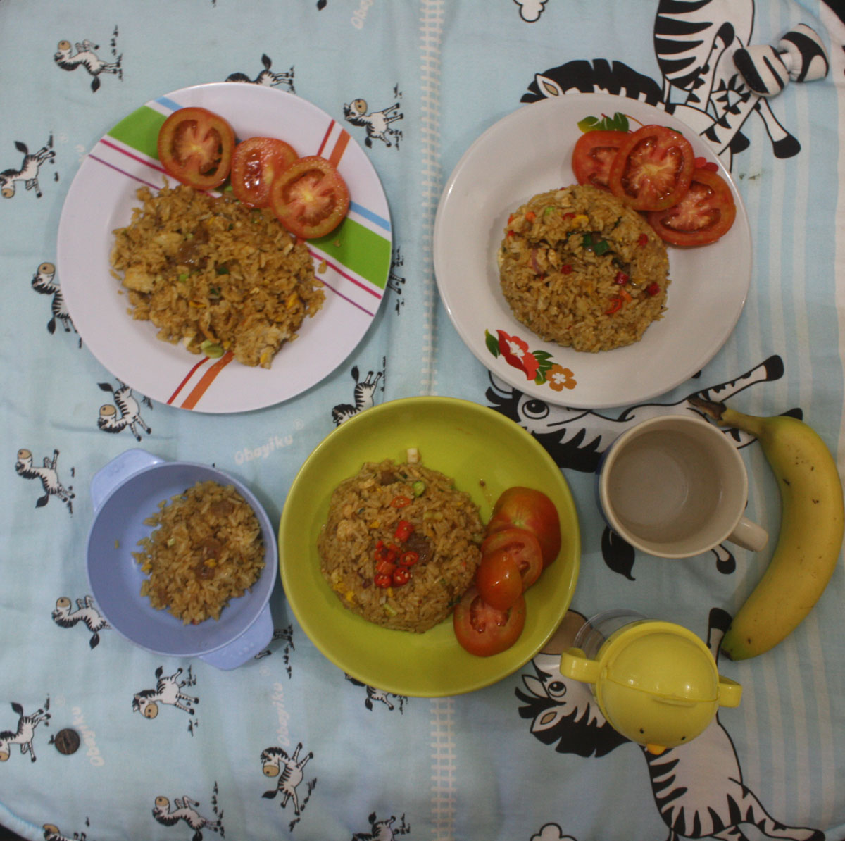 Tadaaaa…sarapannya udah jadi. Cuma butuh 15 menit. Jadi saat di Narend lagi dimandikan oleh daddynya, terus saya lagi sibuk di dapur, saya kasih suprise ini! 🙂 Hehee.. Narend yang baru selesai mandi liat ada warna merah-merah di mangkok makanannya langsung girang! 🙂 Yep, ini adalah ritual saya setiap pagi, bikin sarapan untuk keluarga. Karena Narend udah bisa makan makanan kami, jadi kalau saya masak pastinya bisa sekalian porsinya. Biar hemat waktu.