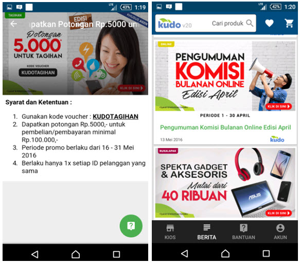 Di aplikasi Kudo, ada banyak penawaran loh, mulai dari kode voucher, komisi bulanan sampai penjualan barang-barang via marketplace lain dan semua itu bisa dilakukan dari Kudo 🙂