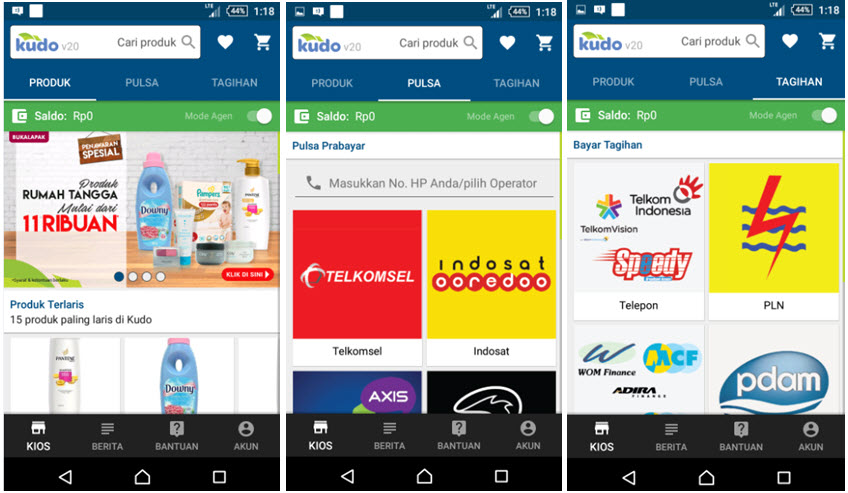 “Sebelum memulai berjualan, kita harus paham terlebih dahulu senjata yang akan kamu gunakan, dalam hal ini adalah aplikasi Kudo itu sendiri“, Nah kalau kamu sudah register, langsung aja deh login, kamu akan langsung menuju ke menu utama, disini kita lihat dari menu paling kiri, disitu ada produk apa saja yang ada di Kudo, nah produk-produk inilah yang bisa kamu jual. Kalau kamu mengira kamu hanya bisa berjualan produk-produk biasa seperti shampoo, sabun, tenang saja, disini kamu bisa berjualan pulsa prabayar juga loh, dan asiknya kamu bisa jadi agen untuk pembayaran listrik, telepon, air bahkan bayar cicilan motor dan mobil, semua via aplikasi Kudo.